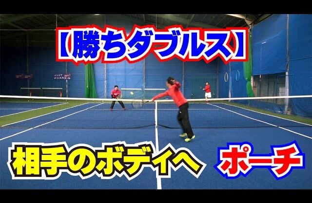 ダブルスで雁行陣同士の時に、ポーチに出て、相手からのボールが低めで速いボールだった場合には相手ボディへ打ちます。ある程度ボールの高さがあれば足元を狙いますが、低い場合には相手の右肩を目標にします。打ち方のポイントについて説明します。