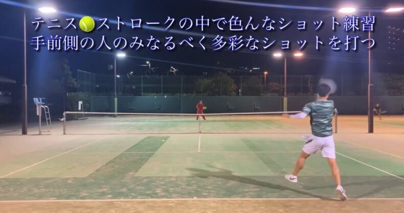 手前側の人のみ→ストロークの中でショットの速度を変えたり,トップスピン,スライス,ドロップ,ボレー,スマッシュ等の色んな球種を練習