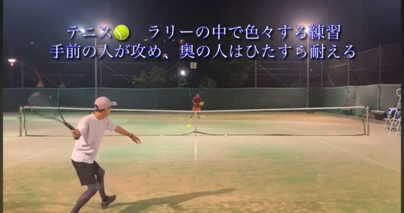 手前側の人のみ→ストロークの中でショットの速度を変えたり,トップスピン,スライス,ドロップ,ボレー,スマッシュ等の色んな球種を練習
