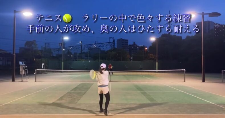 手前側の人のみ→ストロークの中でショットの速度を変えたり,トップスピン,スライス,ドロップ,ボレー,スマッシュ等の色んな球種を練習