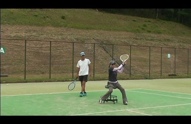 回転椅子に座って打ち易いボールがマシンから送られて、それを自転車に座ってハンドルを持っている感覚で構えて、ボールが弾むまでに回転椅子を足で蹴って右回転させて、身体はゴールデンポジションのまま約90°横を向いて段取りして、ボールが弾んで良い高さになった時に回転椅子を90°左回転させてインパクトを通過しながら、今度はその遠心力と惰性で腕が斜め上にスイングされて(振られて)左手にラケットが収まる形をマスターすれば、回転椅子&ゴールデンポジション合体打法が完成します。