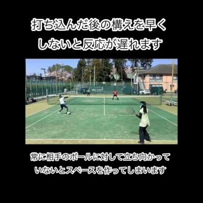 ダブルスのアドコート側で、ボレー合戦で相手が前に詰めて来た時に、相手のバック側の斜めに方向(最も長いコート)にボレーロブで超えるとエースになるので、この戦略とコツと狙うコースを常に意識してネットプレーを行うことが出来ると素晴らしい。