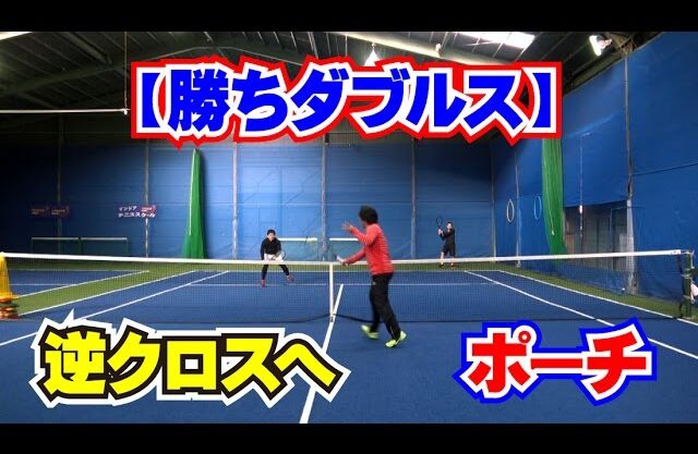 ダブルスで雁行陣同士の時に、逆クロスへのポーチが決まるとポイントが取りやすくなります。とはいえ、クロスやセンターよりも難しいコースですので、斜めに短く打てるように打ち方やラケット面の動かし方について説明します。