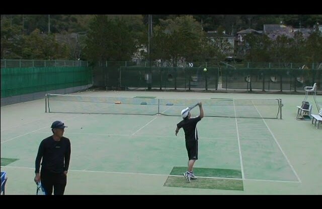 ⑥足の地球力から運動連鎖でうねらずにコートの中に左足が飛び込んで打つ。