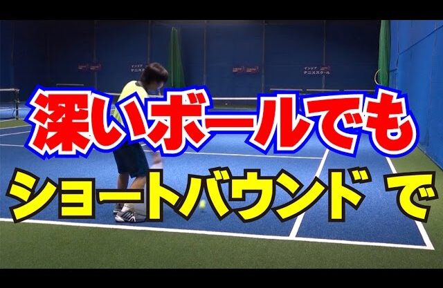 深いボールをベースライン付近に打たれた時に、後ろに下がらずにショートバウンドのライジングで打ち返す方法の紹介です。自分のポジションが悪くなりませんので、これであなたのテニスが楽になる?