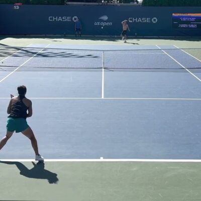 ダブルバックハンドストロークでインパクト前後で如何に左肘が打つ方向に綺麗に真っ直ぐ伸ばせるスイングができるかをテーマに送ります。