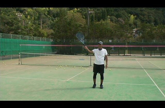 今回もピンクのテープを張って、それよりも高い軌道のボールをフォアーハンドでサービスライン付近からアプローチボレーで相手コートのサービスライン付近にピンクテープよりも低く返球して、相手の時間を奪うレッスンをお伝えします。