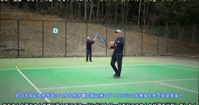 今回は、久しぶりに有ちゃん・西ちゃんのテニス塾で2人が並列に並んで打ってフォアーハンドストロークの比較をして色んなコメント(アドバイス)を字幕で書いて見ました。