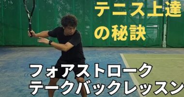 フォアハンドストローク テークバックレッスンテニス上達の秘訣 フォアハンドストロークテークバックについて解説しました。デモンストレーションは生徒の高…