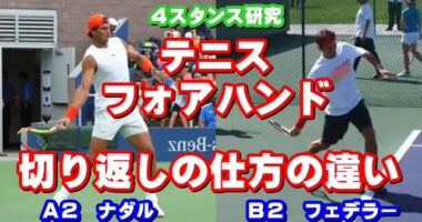 【4スタンス研究】テニス フォアハンドストロークでの切り返しの仕方の違いについて。A2ラファエル・ナダルとB2ロジャー・フェデラーのフォアハンドストロークを…
