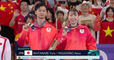 【バドミントン混合ダブルス】2大会連続の銅メダル!ワタガシペア 渡辺勇大・東野有紗メダルセレモニー|パリオリンピック™【パリオリンピッ…