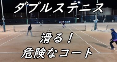 上高田ダブルステニスナイター【滑る!危険なコート&強風その③】中々上達しないテニスです。東京は夜8℃!ツルツルの人工クレーコートです。おまけに強風で…