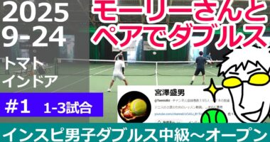 モーリーさんとダブルス【テニス】宮澤盛男出場試合インスピ男子ダブルス中級~オープン【1-3試合目】インスピリッツテニスクラブ草トー大会 トマトインドアテニス…