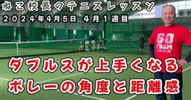 ねこ校長のテニスレッスン4月5日レッスンドキュメンタリー ボレーの打ち分け 来た通りに返してから角度をつける2024年キンイチD ダブルスでショ…