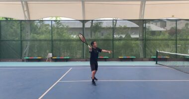 休憩中にボレーの練習。塚田健一郎中国 雲南省昆明 先策学校テニスチームコーチ【プレーヤーキャリア】桜田倶楽部所属元ナショナルジュニアメンバ…
