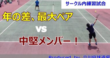 【テニス試合動画】【ダブルス】サークル最年少の大学生と最長老がペア!親子以上の年の差を感じさせず、サークル中堅メンバーのペアと好勝負を繰り広げる!テ…
